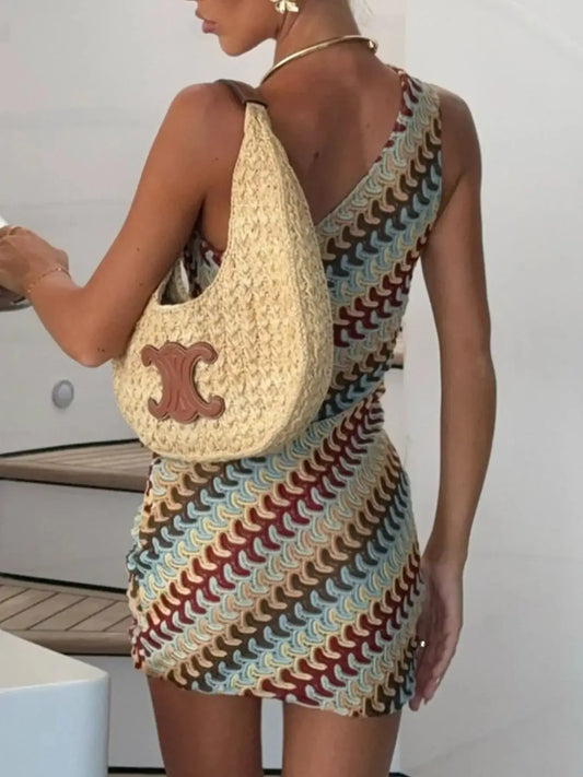 Hollow sexy tight short skirt with hollowed waist and one shoulder patchwork dress
