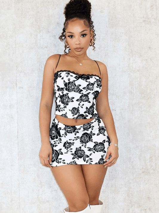 Women's new fashion rose print suspenders sexy slim hip skirt set
